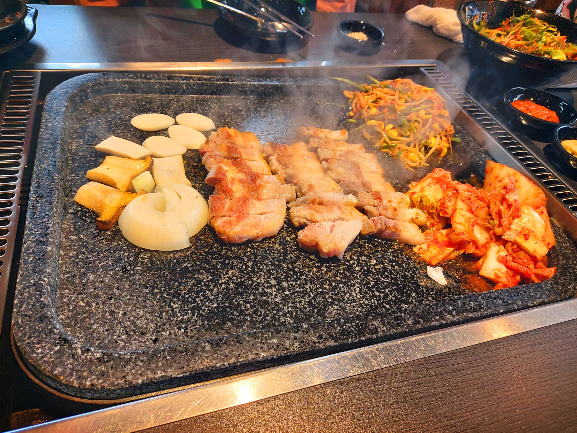 돌판 구멍으로 삼겹살 기름이 흘러가는데 그 기름에 볶아먹는 김치랑 콩나물이 그렇게 맛있더라요.
