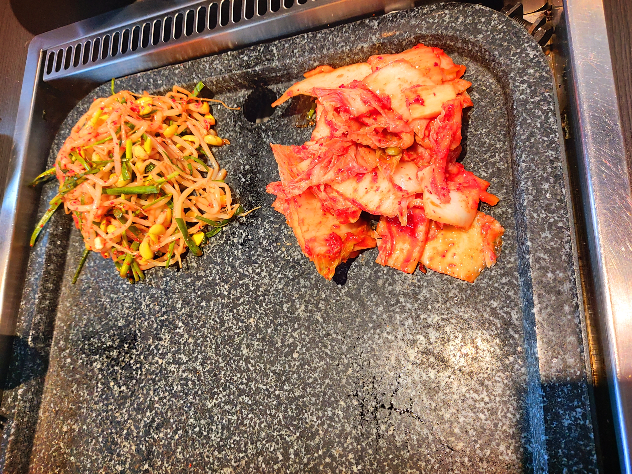 이 돌판에 구워먹는 김치랑 콩나물이 기가 막히거든요!