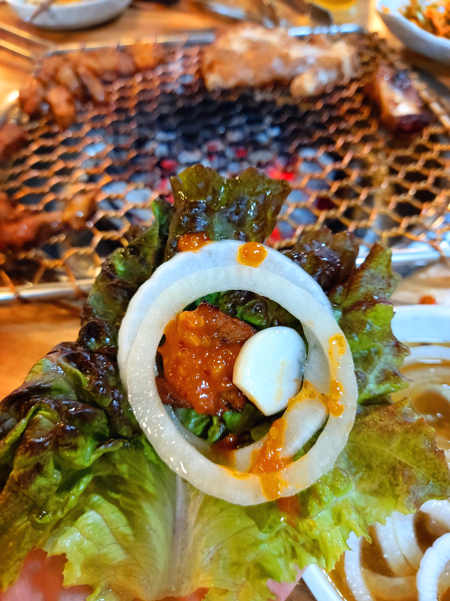 일단 기본적으로 제공되는 쌈야채, 쌈장, 편마늘, 양파절임, 묵은지입니다.