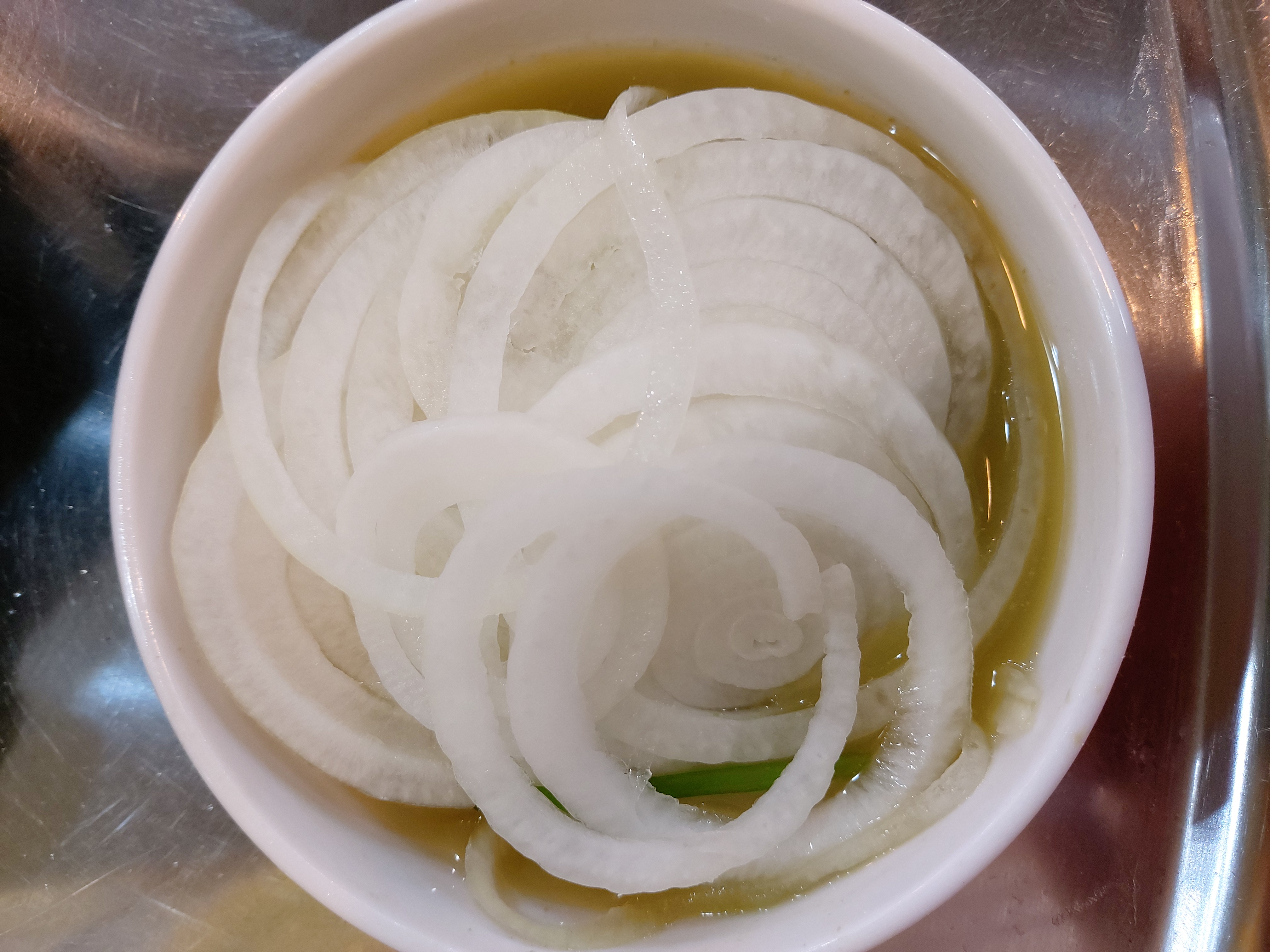 쌈야채, 고추, 양파 슬라이스, 참 간장 소스, 배추김치, 무생채, 쌈장, 마늘, 대파, 사골국, 버섯, 소금이 기본으로 제공되는데 만약 부족하시면 셀프바에서 가셔서 직접 더 떠서 드시면 됩니다.