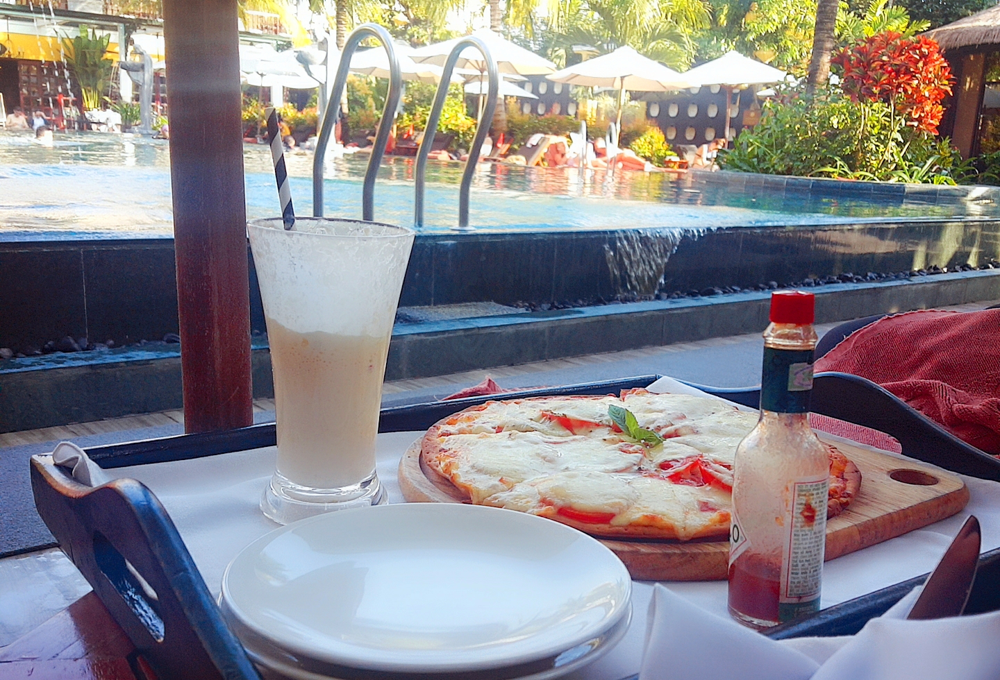 수영하다 보니 배가 고파져서 룸서비스를 시켰습니다.