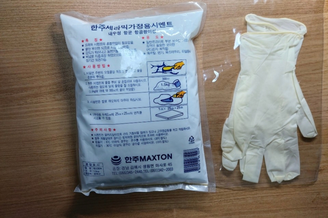 구매하시고 택배로 받으시게 되면 시멘트와 함께 작업용고무장갑이 동봉되어 있습니다.😊
