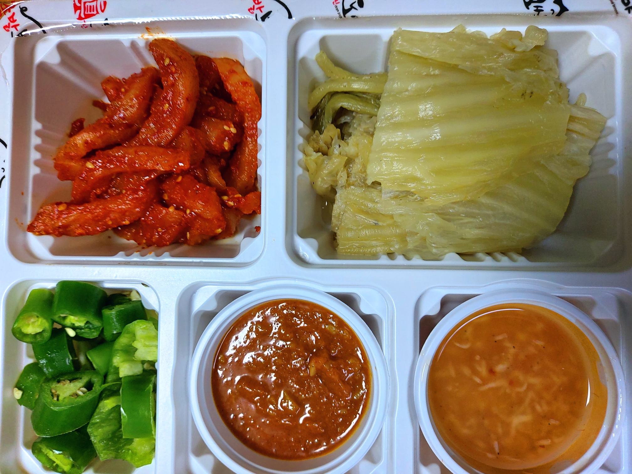 무김치, 묵은지 김치, 고추, 마늘, 쌈장, 새우젓, 김치를 주시더라구요!
